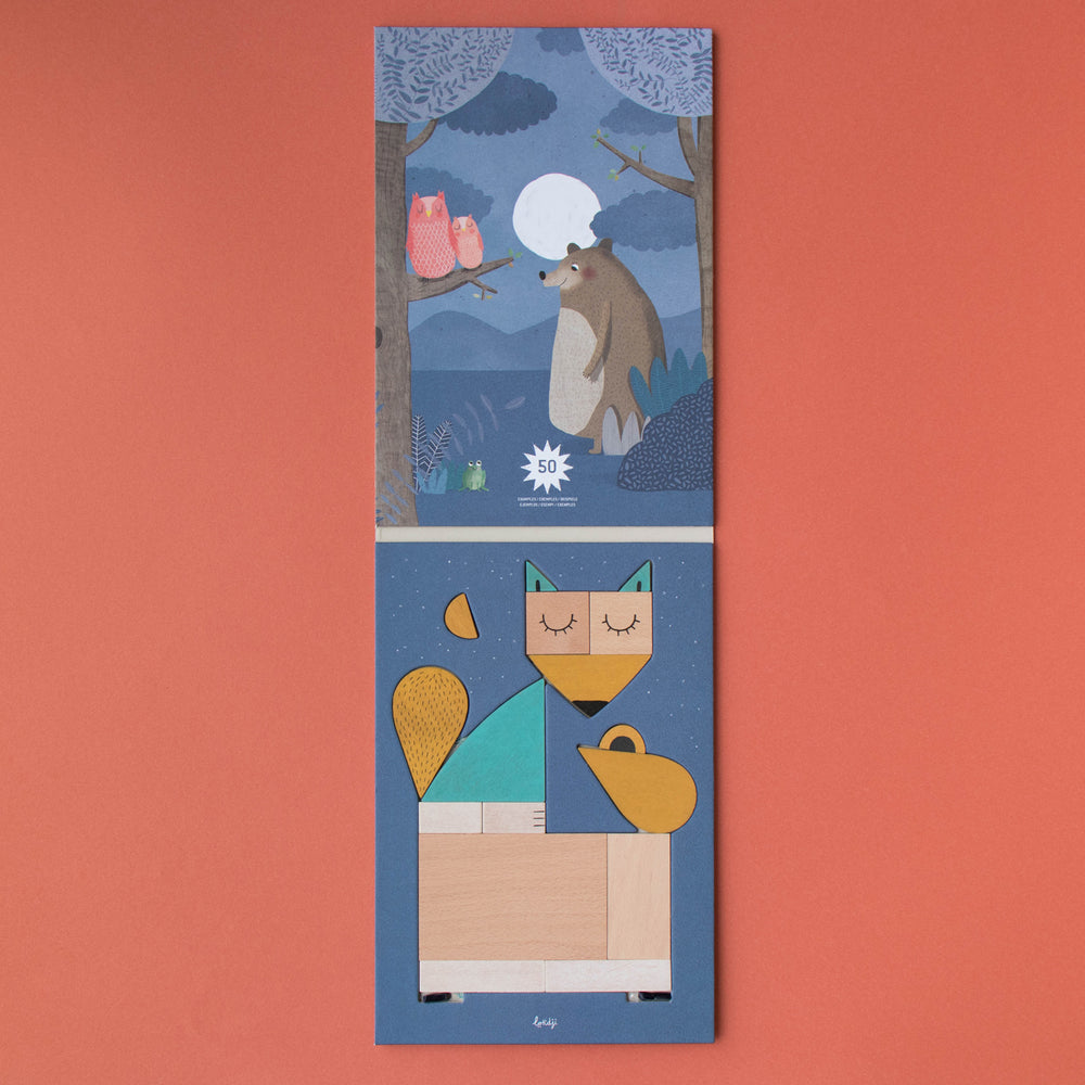 16 coloured wooden pieces will open an imaginary world inhabited by cats, whales, owls and foxes...