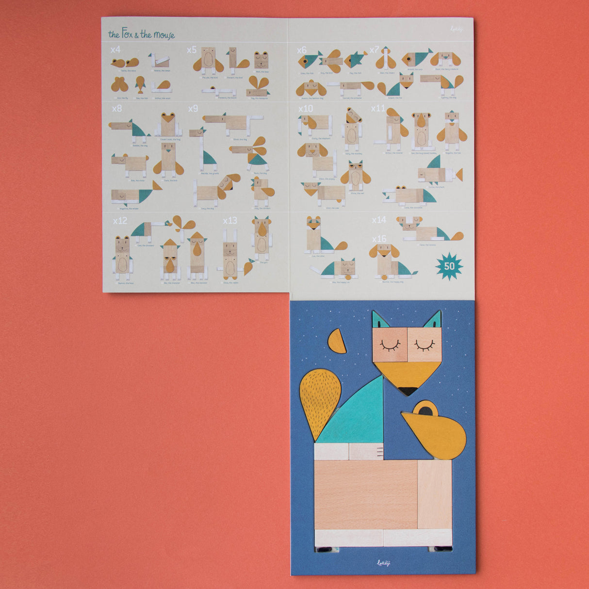 Londji proposes a series of animals to reproduce with the 16 wooden pieces of the game. You can also play freely creating the animals from your imagination.