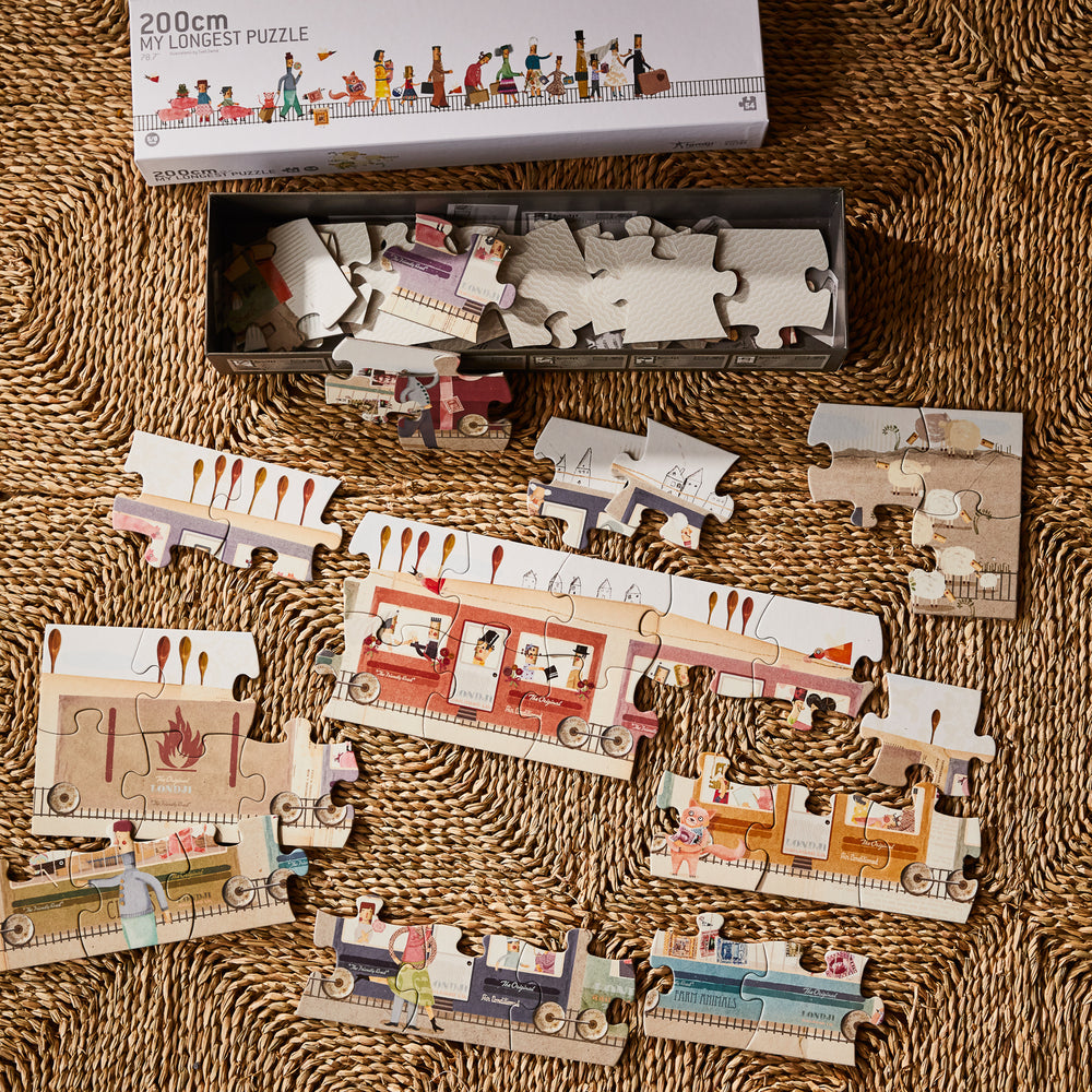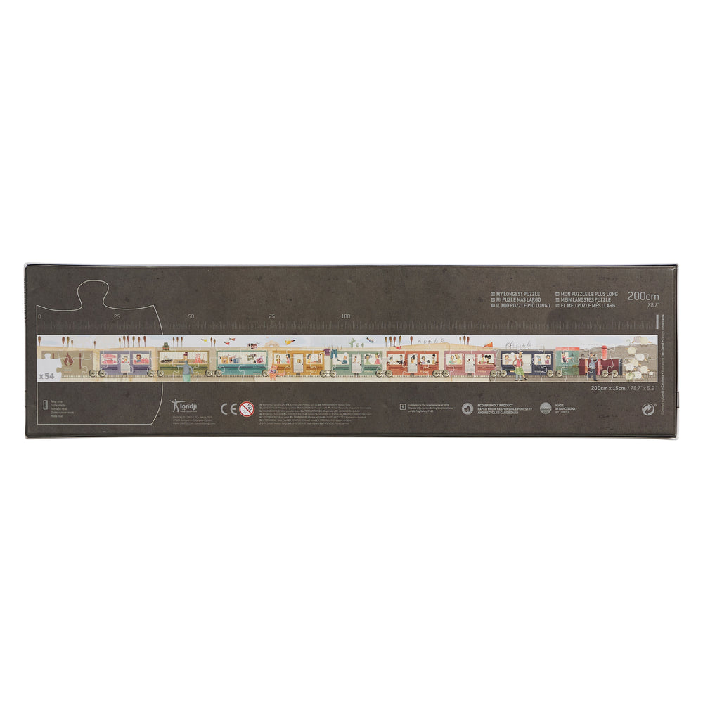 An amazing puzzle of a 2 meter long train! It's really long, this puzzle! 54 pieces and we keep it in a box that already hints at its shape.