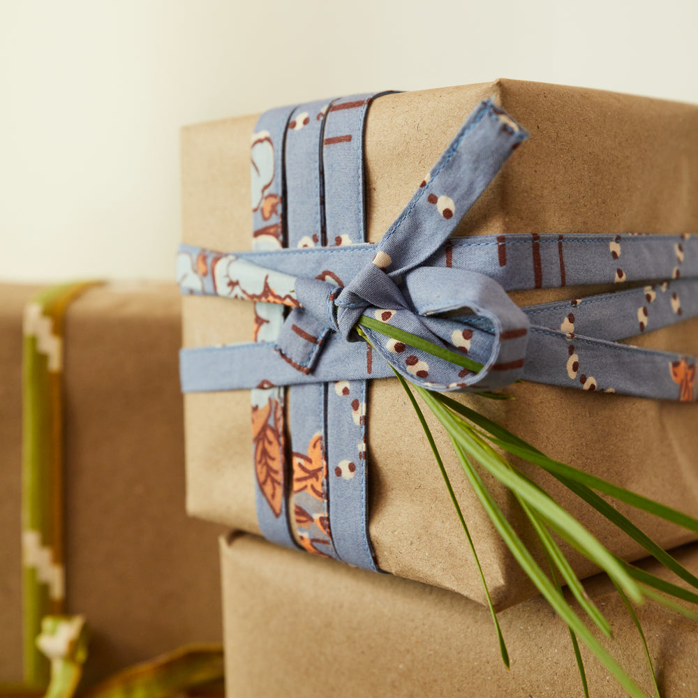 Our gift wrap ribbon, made from our fabric remnants, turns every present into a thoughtful work of art.
