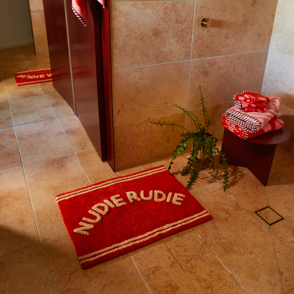 - One of the best things about our Nudie Rudie Bath Mats is that each letter is created by a different artisan. Each bath mat is passed down a production line and there is one person responsible for creating each letter, so it takes 10 magical artisans to create each Nudie Rudie Bath Mat!