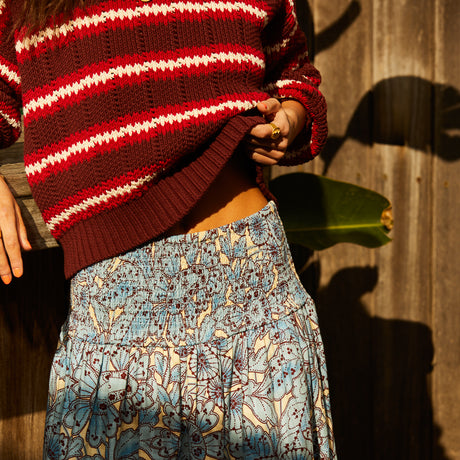 Our knitwear is made for moments when comfort meets style. Layer a lightweight jumper over wide-leg bottoms for a breezy, throw-on-and-go look—just add slides or denim for effortless ease. For a polished edge, tuck a cropped knit into tailored high-waisted pants, or pair a relaxed sweater with a flowing midi skirt for a balance of softness and sophistication. Finish the look with accessories that make a statement—think a velvet pouch for evening plans, a roomy tote bag for market mornings or a beaded clutch when the occasion calls for a little extra fun.
