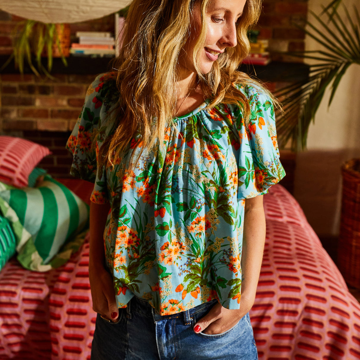 Designed for long lazy summer days, our double cloth cotton blouses are a gorgeous addition to any wardrobe. A swing style silhouette with a cropped length and delicate ruffle sleeve delivers a playful touch of vintage flair.
